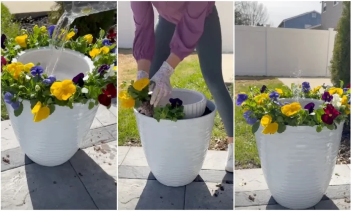Ovo je faza gde vaša fontana dobiva lični pečat i integriše se sa ostatkom dvorišta. Oko ivice unutrašnje posude, u zemlju spoljne saksije, sadite odabrano cveće. Ideja je da se formira bujna, prirodna “kruna” koja će delimično prikriti unutrašnju posudu i stvoriti utisak da voda izvire iz samog cveća. Maćuhice su odličan izbor zbog svog gustog, jastučastog rasta i dugotrajnog cvetanja, ali možete eksperimentisati i sa drugim niskim i gušćim biljkama kao što su sanvital, begonije ili male trajnice. Rasporedite ih gusto da biste postigli željeni dekorativni efekat.